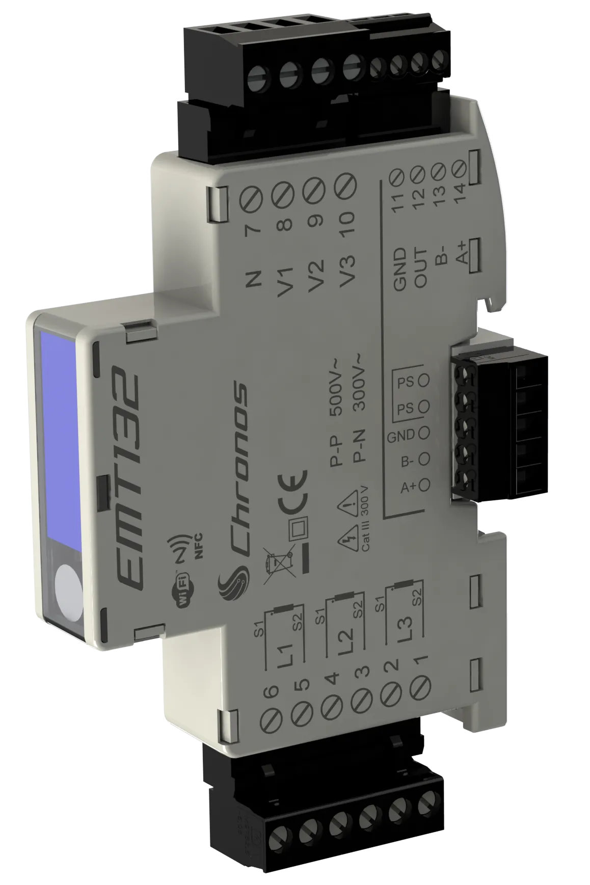 Analizzatore di rete trifase con alimentazione 10..36Vdc, con display grafico a colori, porta RS485, Wifi, NFC, buzzer, uscita impulsiva.
